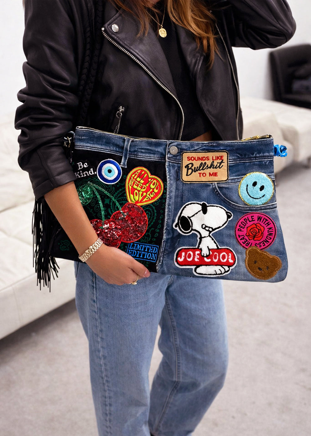 Een krachtige mix van bandana, leather look en speelse patches, afgewerkt met statement fringe voor die extra attitude. Van day look tot night out – ze tilt elke outfit moeiteloos naar een hoger niveau.