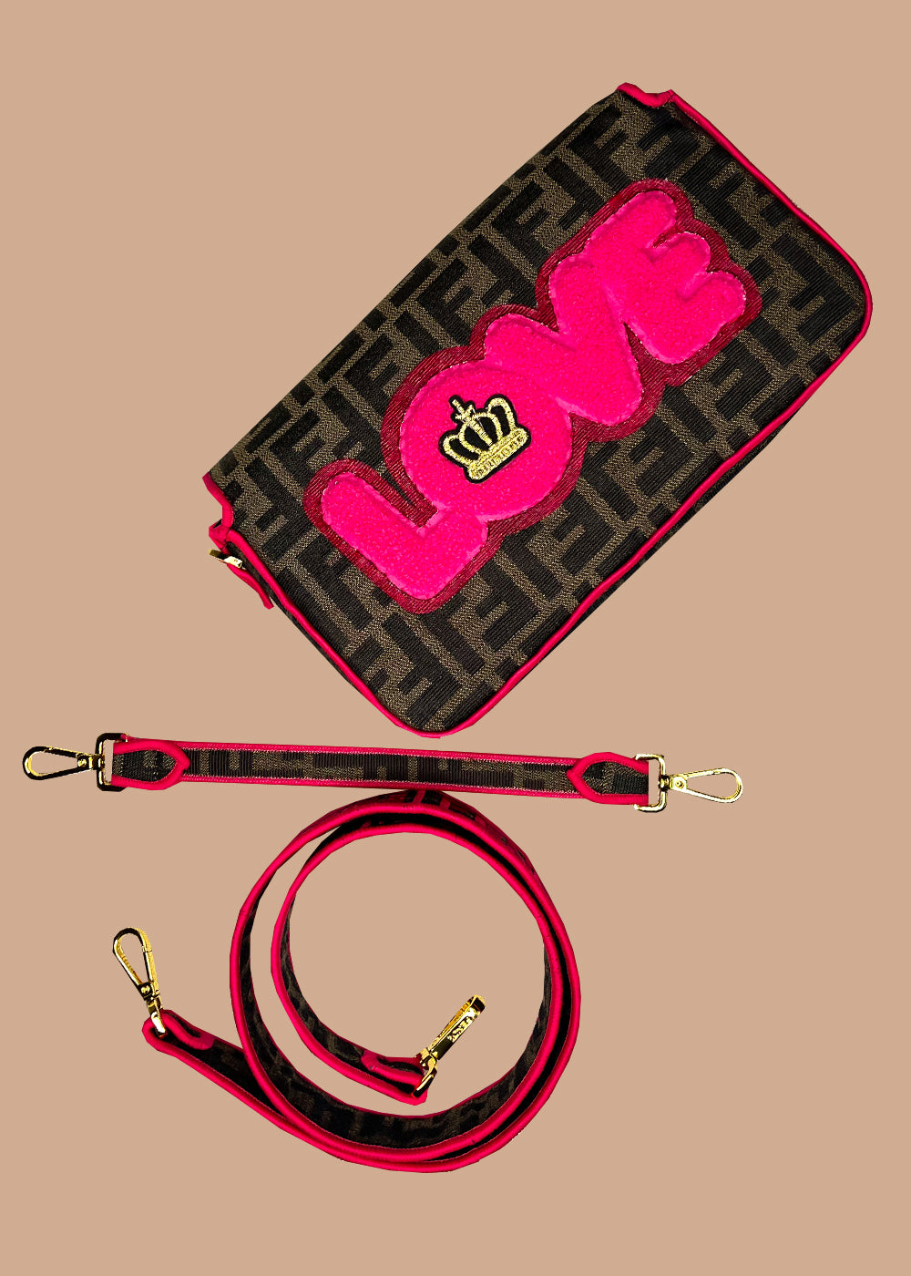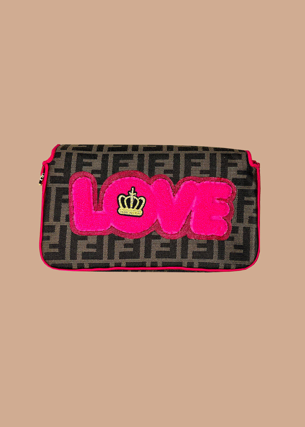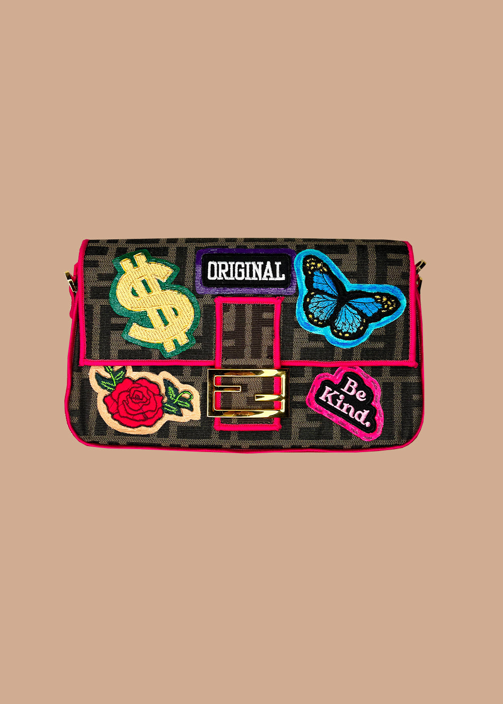 Meet the OG Baguette: Where art meets attitude. De klassieke baguette shape gecombineerd met kleurrijke patches, hot pink piping en gold hardware maakt deze tas instant eye-catching.