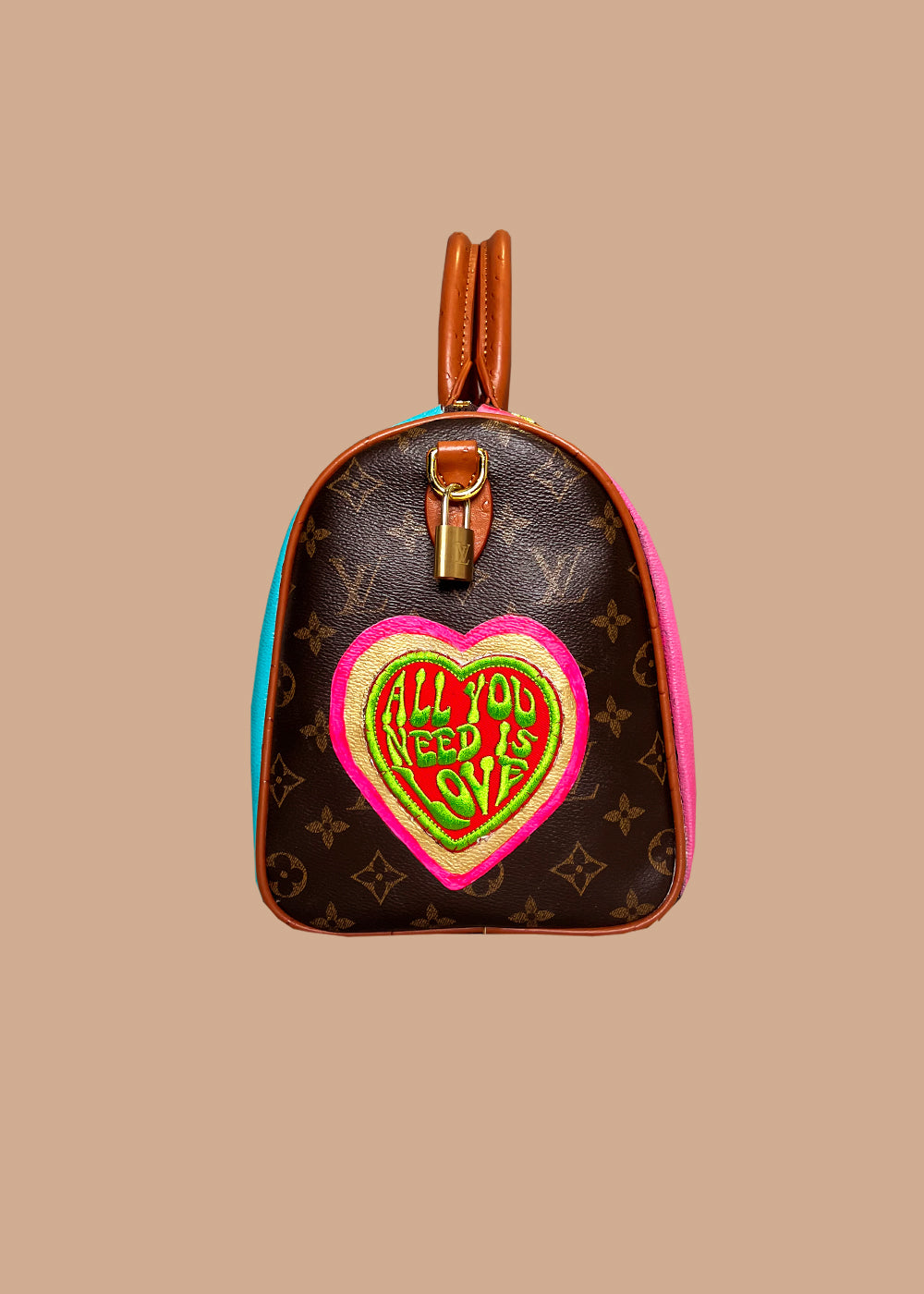 Statement bag with a wink 🩵 a wearable piece of art, each bag is unique and hand painted. The bag is made of denim and comes with all accessories shown in the photo and a long strap so it can also be worn as a shoulder bag. You should wear the bag open, Just like a B⭐️RKIN. Silver hardware and with an OGOSH dust bag.